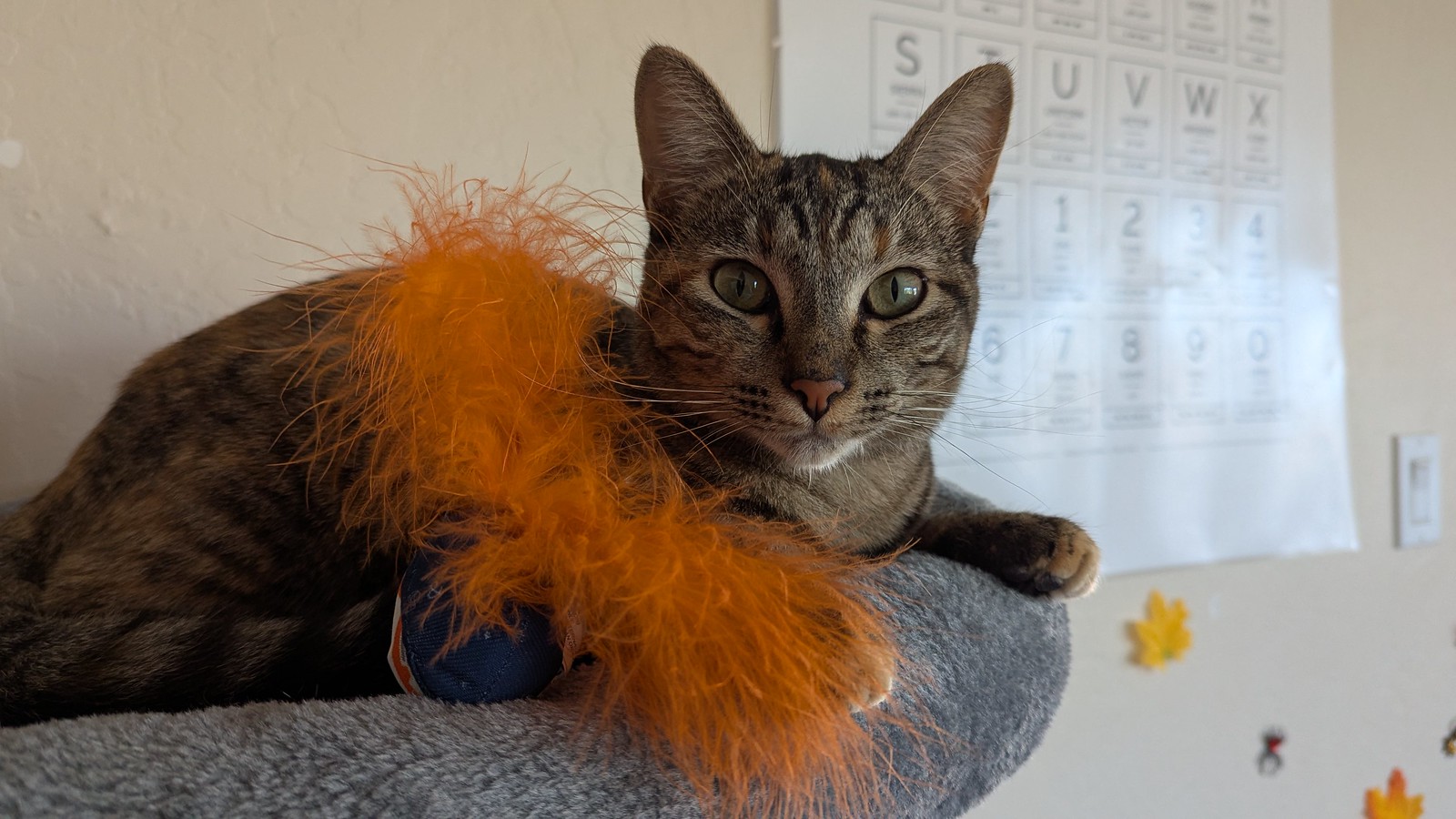We’re her second family, and her first family is the one that named her. Alas, we were told they surrendered her with the reason that she was an indoor/outdoor cat, but would disappear for days at a time outside, and that wasn’t working for them. With us she’s indoor-only, so we should be able to avoid that particular hurdle, unless she gets out. We’re looking at AirTags as a solution to her potentially escaping and disappearing, but that assumes she’s willing to wear a collar.