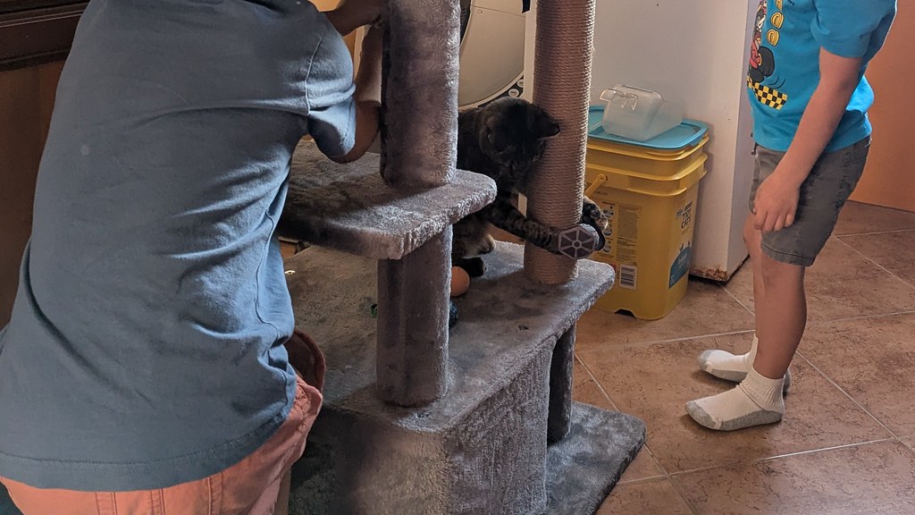 She was eager to explore though, and settled in pretty quickly once she had the run of the house on Monday (Labor Day) and we moved the cat tree into the family room. We had a pretty laid back day welcoming our new cat to our home, and the boys had a lot of fun playing with her.