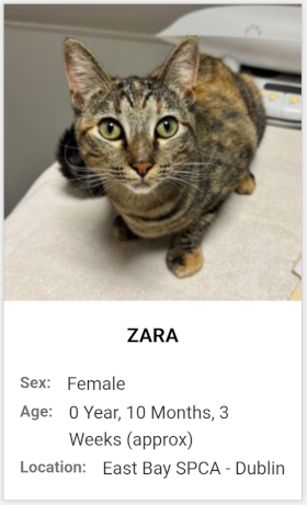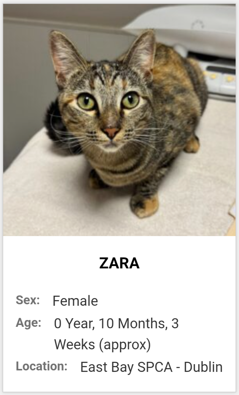 But I was ready for this potential outcome. I had scoured shelters ahead of time and found a tortoiseshell-tabby (torbie) at the East Bay SPCA in Dublin, it was Zara!